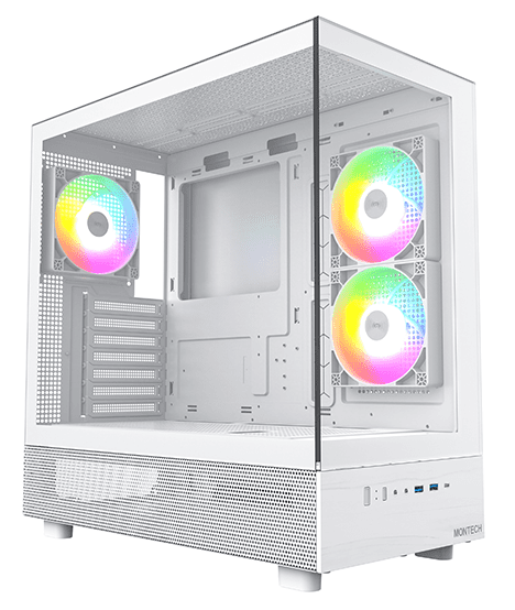 Montech XR White Mid Tower ATX Case, Tempered Glass Side Panels, NO PSU, 2x USB 3.0, 1x USB-C 3.2, 1x HD Audio, 3x 120mm ARGB PWM Fans Pre-Installed, Support NVIDIA GeForce RTX 40 Series